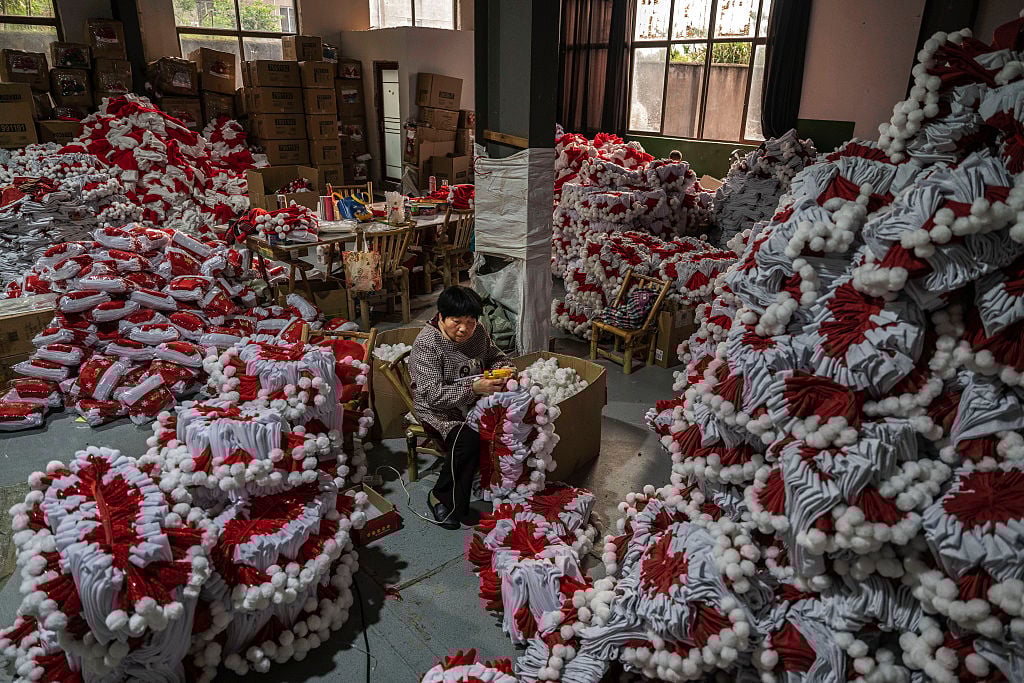Am 28. April 2025 in einer Fabrik in der Nähe von Yiwu in der chinesischen Provinz Zhejiang: Rote Weihnachtsmützen für den Export. Foto: Kevin Frayer/Getty Images