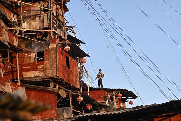 20. Mai 2025 in Xingyi, im Südwesten der Provinz Guizhou. Der 42-jährige Chen hat sieben Jahre und über 100.000 Yuan (12.100 Euro) investiert, um sich den Abrissverfügungen der Behörden zu widersetzen und das Steinhaus seiner Familie in ein verwirrendes 10-stöckiges pyramidenförmiges Haus zu verwandeln. Es wird in den chinesischen sozialen Medien mit den fantastischen Kreationen des japanischen Animators Hayao Miyazaki verglichen. Foto: Pedro PardoAFP via Getty Images