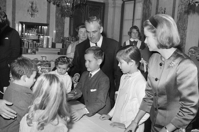 Kinder gehören traditionell überall dazu. Hier die Grimaldi-Familie (Mitte) am 23. Dezember 1966 in Monte Carlo: Fürst Rainier, die Kinder Stéphanie, Albert und Caroline sowie Ehegattin Grace, ehemals Kelly. Foto: AFP via Getty Images