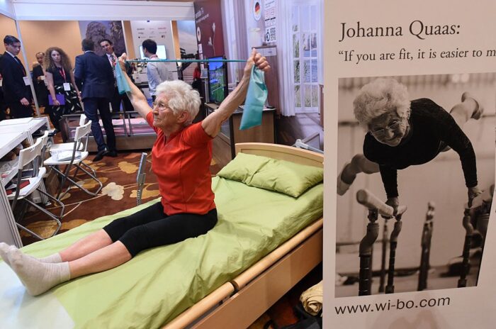 Die 92-jährige Deutsche Johanna Quaas demonstriert am 25. April 2017 in Singapur Kräftigungsübungen auf einem speziellen Seniorenbett.