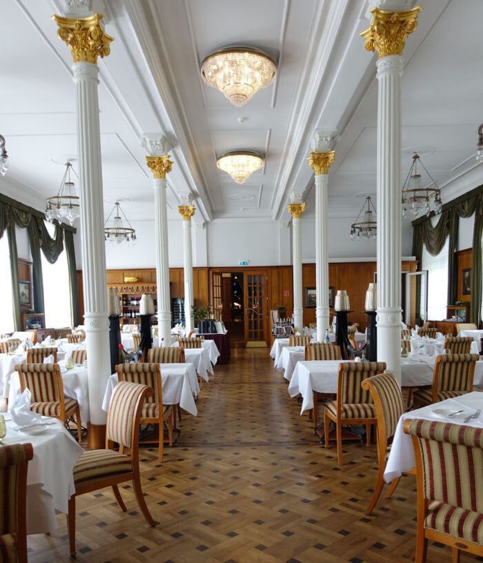Der Speisesaal im „Palmenwald“ mit seinen originalen Säulen und Lüstern aus der Gründerzeit. Foto: Sabine Weigert
