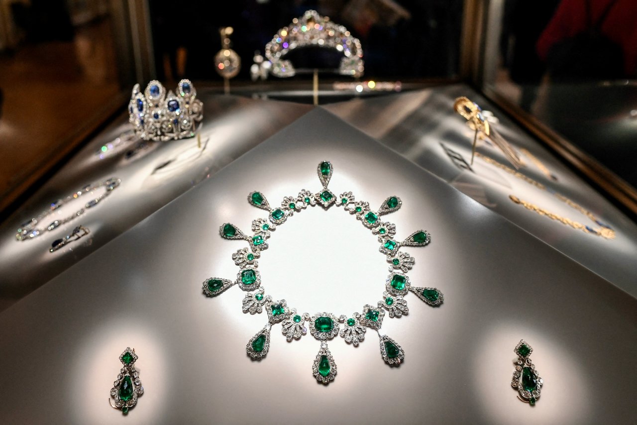 Die Halskette und Ohrringe aus dem Hochzeitsset von Kaiserin Marie-Louise, ausgestellt in der Apollon-Galerie des Louvre. Foto: Stephane de Sakutin/Getty Images