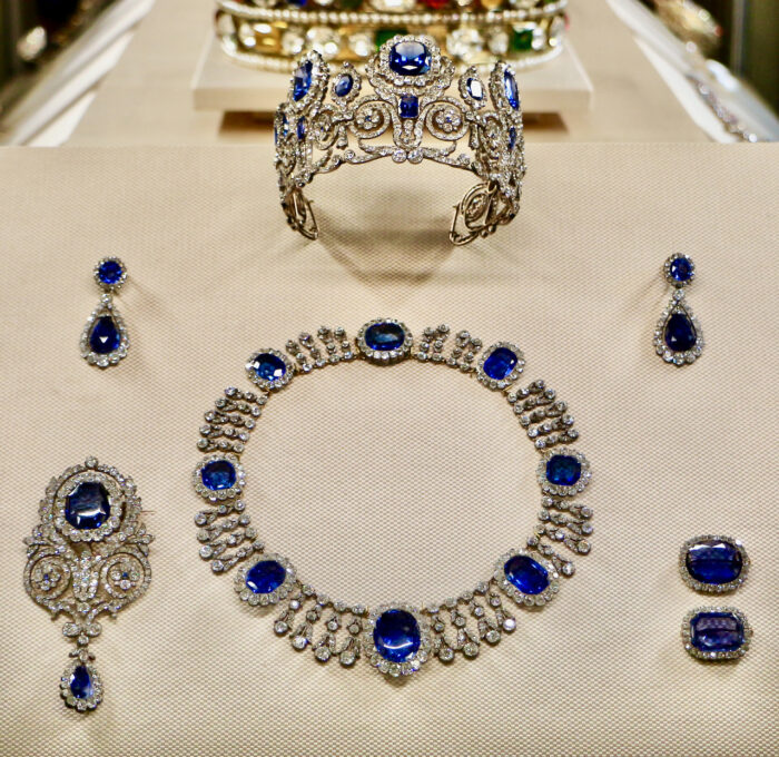 Das gestohlene Saphir-Ensemble, das im Laufe der Jahrhunderte mehrfach umgearbeitet wurde, zierte einst die Hälse mehrerer königlicher Damen. Die erste eindeutig bekannte Besitzerin war Königin Hortense von Holland (1783–1837), die Stieftochter Napoleons. Einer unbelegten Legende zufolge stammten die prächtigen Ceylon-Saphire aus der Sammlung ihrer Mutter, Kaiserin Joséphine – und reichen vielleicht sogar bis zu Marie-Antoinette zurück.