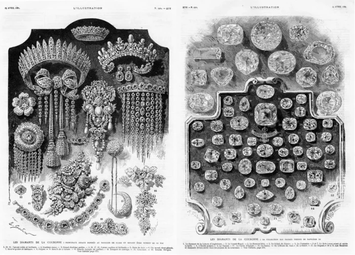 Zu den gestohlenen Juwelen zählen eine Smaragdkette und passende Ohrringe, die einst Kaiserin Marie-Louise gehörten, eine Saphir-Tiara, eine Halskette und ein einzelner Ohrring aus der Parüre von Königin Marie-Amélie und Königin Hortense sowie Kaiserin Eugénies Schleifenbrosche, Tiara und Reliquienbrosche.