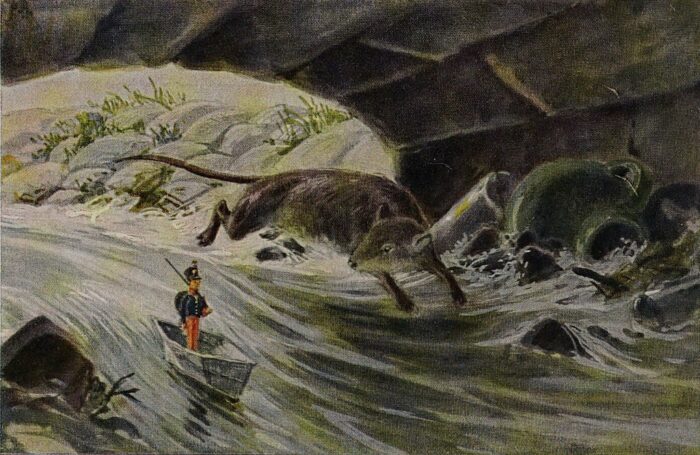 Eine große Ratte fordert von ihm einen Passierschein, doch der Zinnsoldat bleibt standhaft und schweigt, die Ratte keiner Reaktion würdigend. Das wilde Wasser reißt das kleine Boot mit sich fort, verfolgt von der keifenden Ratte, die wütend Wegezoll einfordert. Dank der starken Strömung bleibt das Ungetier bald schon in der Ferne zurück. Das Boot jedoch hat sein Ende erreicht und kentert aufgeweicht in einem kleinen Wasserfall. Der kleine Zinnsoldat sinkt in die Fluten – und wird von einem großen Fisch verschluckt …