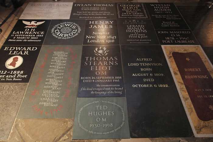 Dezember 2011, London, England: Der Poets‘ Corner der Westminster Abbey zeigt Gedenkplatten für britische Literaturgrößen wie Lord Alfred Tennyson, D.H. Lawrence, T.S. Eliot und William Shakespeare. Foto: Dan Kitwood/Getty Images