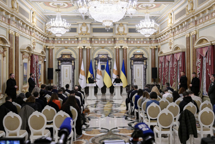 Der Präsident der Ukraine, Wolodymyr Selenskyj (Mitte r), hält gemeinsam mit dem Präsidenten Zyperns, Nikos Christodoulides (Mitte l), nach ihrem Treffen in Kiew am 4. Dezember 2025, eine gemeinsame Pressekonferenz ab. Foto: Genya SAavilov/AFP via Getty Images