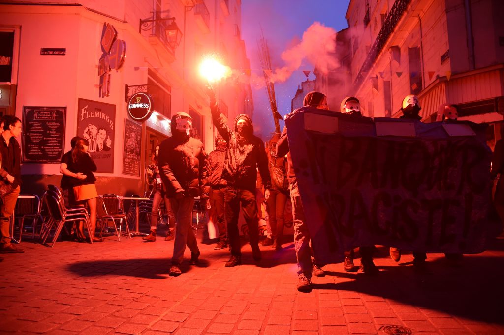 Anhänger der Antifa in Nantes, Westfrankreich, am 23. April 2017 nach Bekanntgabe der Ergebnisse der ersten Runde der Präsidentschaftswahlen. Damals gewann Emmanuel Macron vor Marine Le Pen. Foto: Jean-Sebastien Evrad/AFP via Getty Images