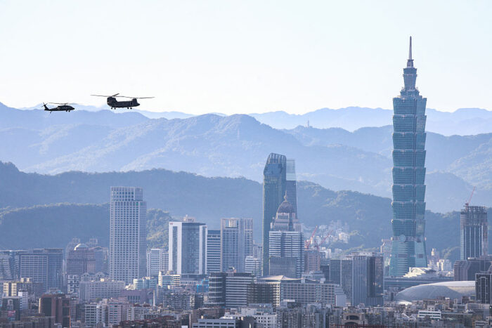 Ein Sikorsky UH-60M Black Hawk-Hubschrauber (l) und ein Boeing CH-47SD Chinook-Tandemrotorhubschrauber fliegen im Rahmen der Proben für den taiwanesischen Nationalfeiertag am 2. Oktober 2025 in Taipeh am Taipei 101-Gebäude vorbei. Foto: I-Hwa Cheng/AFP via Getty Images