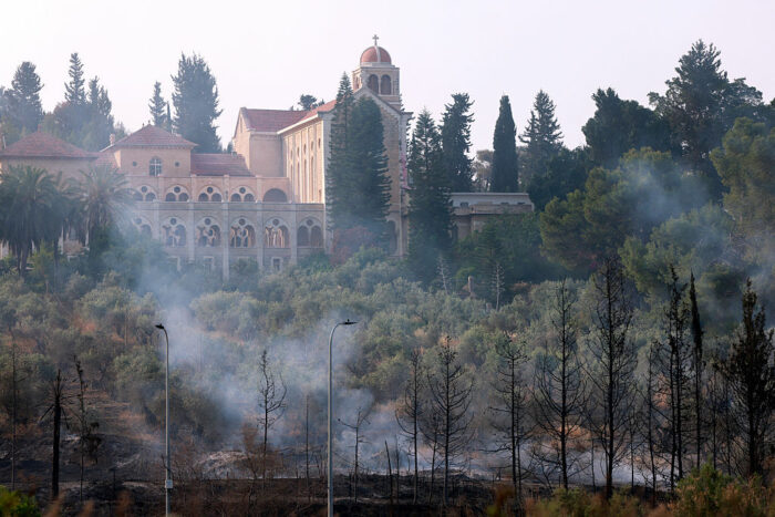 Rauchschwaden in der Nähe des Klosters Latrun in Zentralisrael während des Brandes am 1. Mai 2025. Foto: Menahem Kanada/AFP via Getty Images