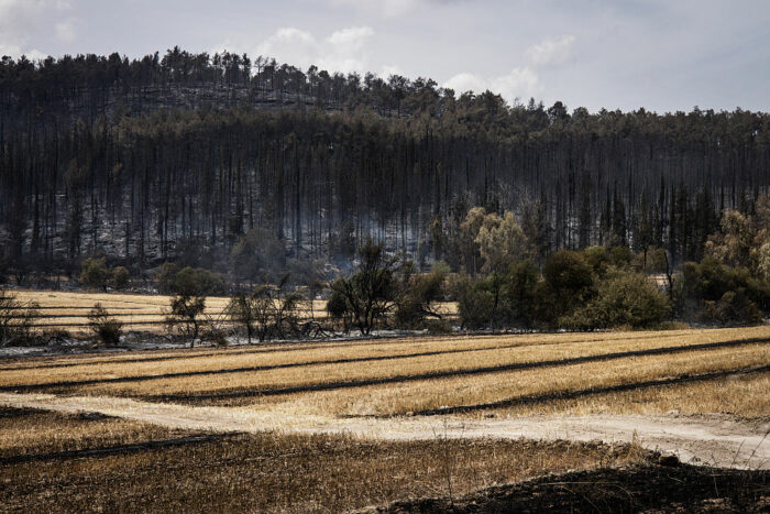 Ein verbranntes Gebiet in Mesilat Zion in Zentralisrael, am 1. Mai 2025. Die Polizei meldete die Wiedereröffnung mehrerer wichtiger Straßen, die zuvor gesperrt waren. Foto: John Wessels/AFP via Getty Images