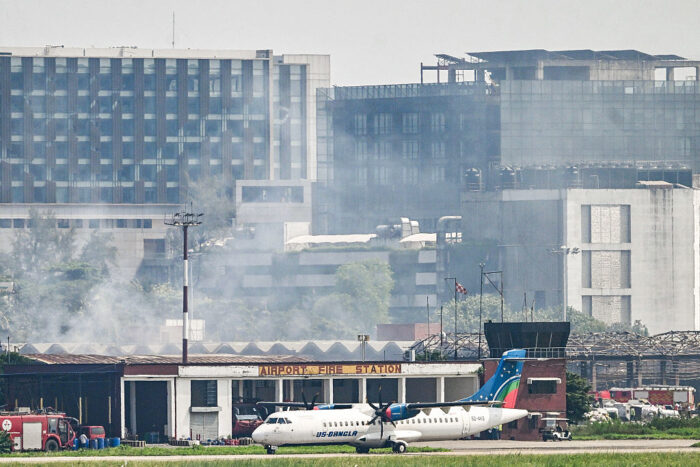 Am 19. Oktober steigt weiterhin Rauch aus dem abgebrannten Frachtterminal des Hazrat Shahjalal International Airport auf. Foto: Munir Uz Zaman/AFP via Getty Images