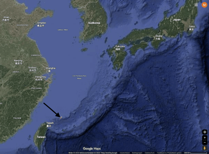 Die Senkaku-Inseln (schwarzer Pfeil) gehören noch zu Japan. Foto: Google Maps