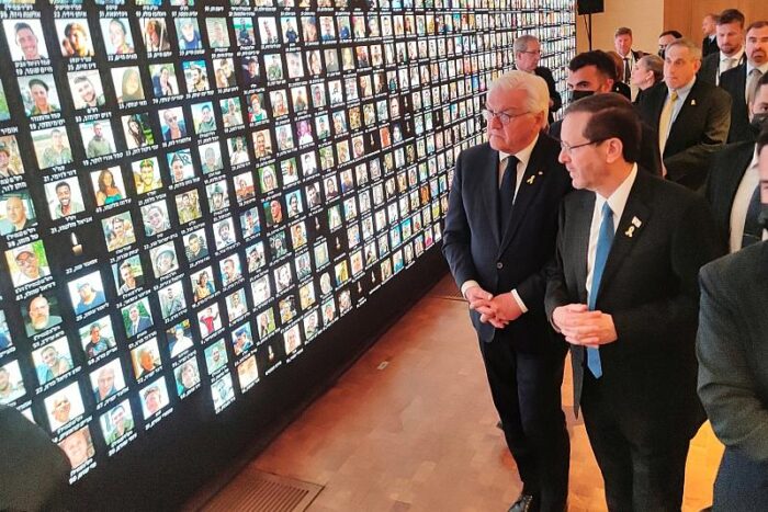 Frank-Walter Steinmeier und Isaak Herzog vor einer Installation, die die Opfer des von der Hamas ausgeführten Terror-Anschlags vom 7. Oktober zeigt (Archiv) Foto: via dts Nachrichtenagentur