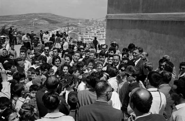Der amerikanische Sänger und Schauspieler Frank Sinatra während eines Besuchs in Nazareth, Israel, im Mai 1962 in einer Menge von Gratulanten. Sinatra, der sich auf seiner „World Tour for Children” befand, nutzte den Besuch, um sein „Sinatra Centre for Children” zu eröffnen. Foto: Graphic House/Archive Photos/Getty Images