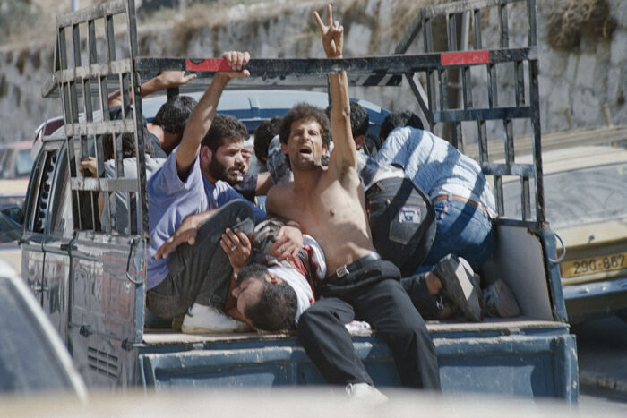 Ein verwundeter Palästinenser wird am 8. Oktober 1990 in Jerusalem ins Krankenhaus gebracht, nachdem es zu Zusammenstößen zwischen Muslimen und Juden gekommen war. Die Tempelberg-Morde von 1990 sind auch bekannt als Al-Aqsa-Massaker oder Schwarzer Montag. Es war die höchste Zahl an getöteten und verletzten Zivilisten seit Beginn der Intifada in einem einzigen Vorfall und innerhalb weniger Stunden. Foto: Sven Nackstrand/AFP via Getty Images