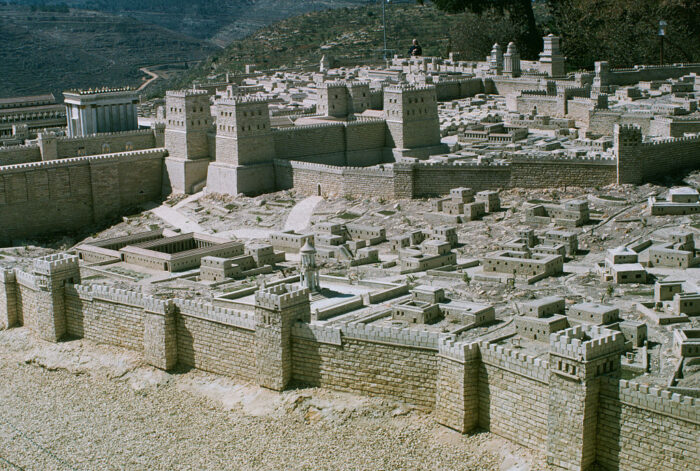 1975: Das Holyland-Modell von Jerusalem, ein Modell im Maßstab 1:50 von Jerusalem während der späten Zeit des Zweiten Tempels (zwischen 516 v. Chr. und 70 n. Chr.). Es befindet sich im Holyland Hotel in Beyit VeGan, Jerusalem, und wurde 1966 vom Hotelbesitzer Hans Kroch als Denkmal für seinen Sohn in Auftrag gegeben. Foto: Archive Photos/Getty Images