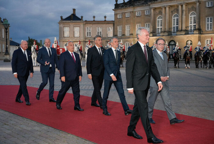 (LR) Österreichs Bundeskanzler Christian Stocker, Bulgariens Ministerpräsident Rosen Zhelyazkov, Ungarns Ministerpräsident Viktor Orban, Kroatiens Ministerpräsident Andrej Plenkovic, der scheidende niederländische Ministerpräsident Dick Schoof, Litauens Präsident Gitanas Nauseda und Belgiens Ministerpräsident Bart De Wever kommen am 1. Oktober 2025 zu einem Abendessen des dänischen Königspaares für die Staats- und Regierungschefs der EU im Schloss Amalienborg in Kopenhagen anlässlich eines Treffens der Europäischen Politischen Gemeinschaft (EPG), das am 2. Oktober stattfinden soll. Foto: EMIL HELMS/Ritzau Scanpix/AFP über Getty Images