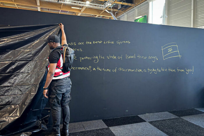 Die Ursache: Behörden sperrten die Stände mit schwarzen Planen ab, weil sie „Offensivwaffen“ ausstellten. Darunter seien auch solche, die im Gazastreifen eingesetzt werden. Das verstoße gegen die mit Israel getroffenen Vereinbarungen.