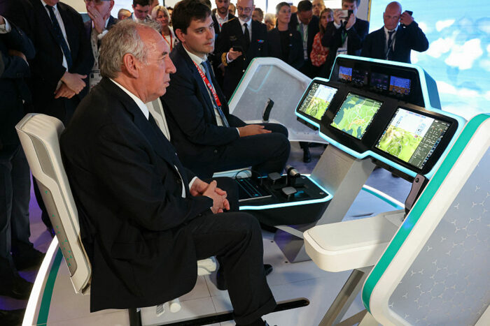 Frankreichs Premierminister Francois Bayrou (l.) am AI-optimierten Armaturenbrett eines Flugzeugcockpits im Thales-Pavillon, 16. Juni 2025. Foto: Alain Jocard/POOL/AFP via Getty Images