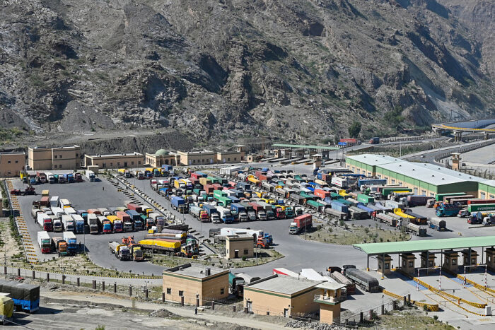Am 13. Oktober 2025 stehen Lkw in der pakistanisch-afghanischen Grenzstadt Torkham still, während es zu Zusammenstößen zwischen den beiden Ländern kommt. Foto: Abdul Majeed/AFP via Getty Images