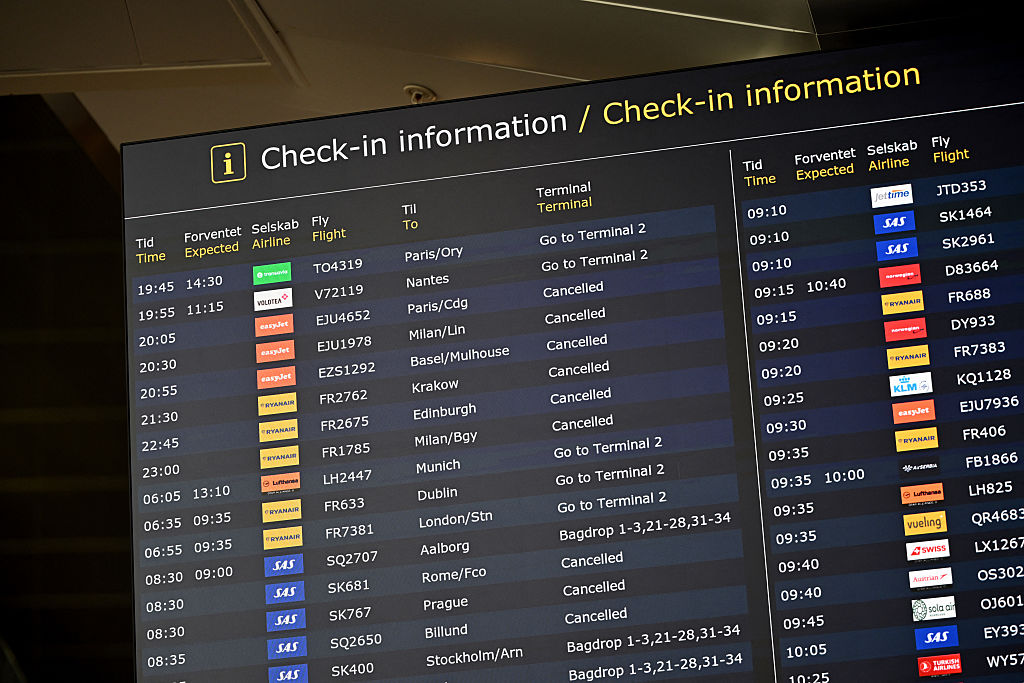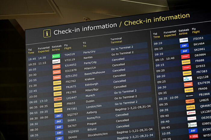 Eine Anzeigetafel zeigt Fluginformationen am Flughafen Kopenhagen in Kopenhagen, Dänemark, am 23. September 2025. Foto: Sergei Gapon/AFP via Getty Images