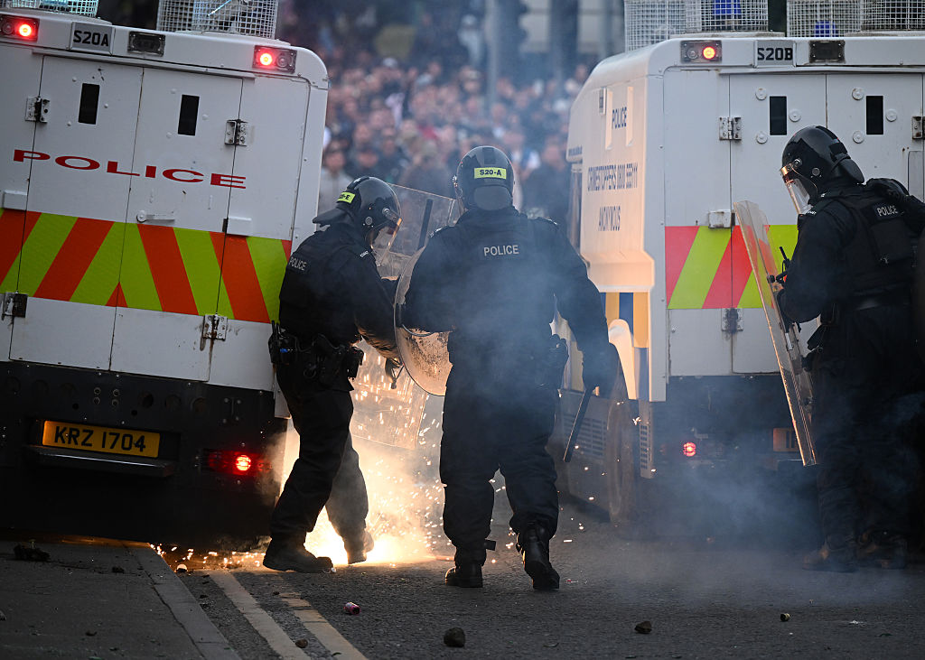 Nächtliche Unruhen am 11. Juni 2025 in Ballymena, Nordirland. Zuvor erschienen zwei rumänische Teenager vor dem Coleraine Magistrates Court, sie wurden der versuchten Vergewaltigung beschuldigt. Foto: Charles McQuillan/Getty Images