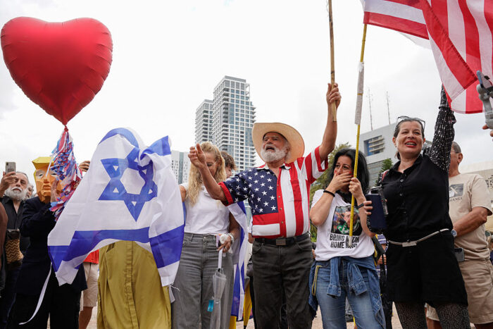 Menschen jubeln am 9. Oktober 2025 auf dem Geiselplatz in Tel Aviv über die Nachricht von einem neuen Waffenstillstandsabkommen im Gazastreifen. Foto: MAYA LEVIN/AFP via Getty Images