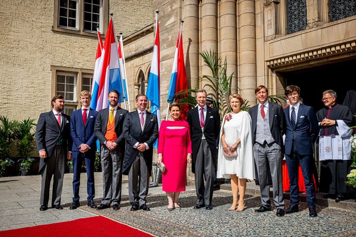 (l-r) Prinz Sebastien, Prinz Noah und Prinz Felix von Luxemburg, Erbgroßherzog Guillaume von Luxemburg, Großherzogin Maria Teresa von Luxemburg, Großherzog Henri von Luxemburg, Erbgroßherzogin Stephanie von Luxemburg, Prinz Louis von Luxemburg und Prinz Gabriel von Luxemburg bei der Te-Deum-Messe in der Kathedrale während der Feierlichkeiten zum Nationalfeiertag in der Philharmonie am 23. Juni 2025 in Luxemburg. Foto: Patrick van Katwijk/Getty Images