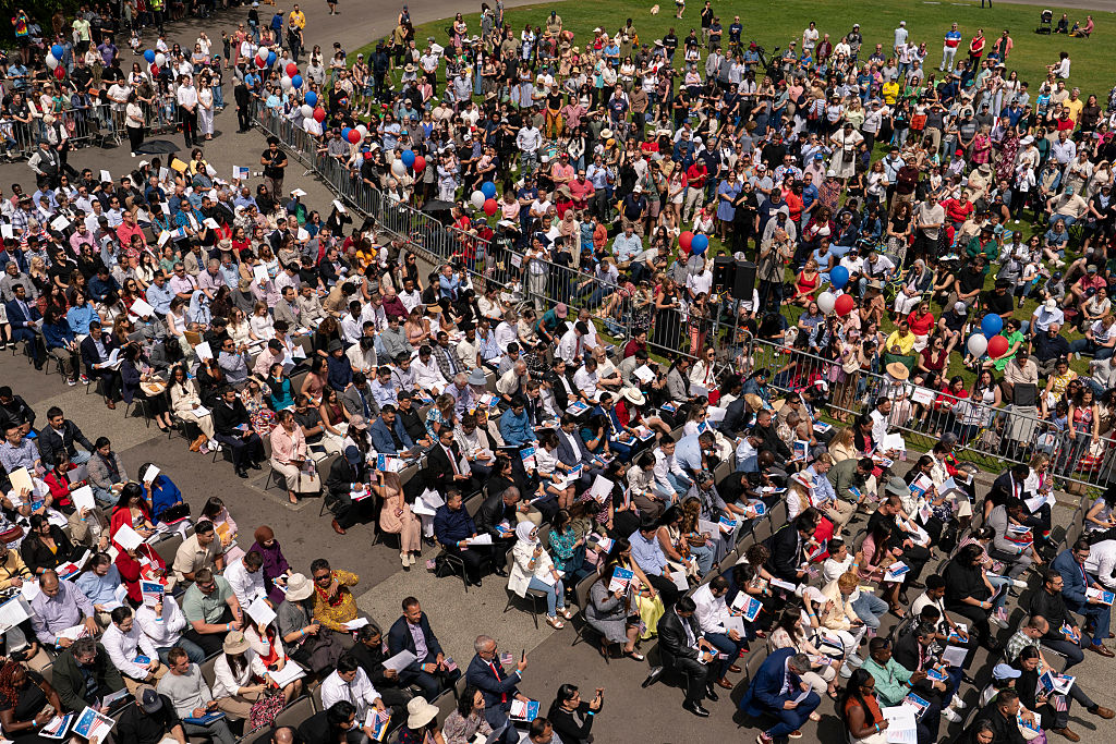 Während einer Einbürgerungszeremonie für neue US-Bürger im Seattle Center am 4. Juli 2025 in Seattle, Washington. Die jährliche Veranstaltung zog Hunderte Teilnehmer aus rund 80 Ländern an. Foto: David Ryder/Getty Images