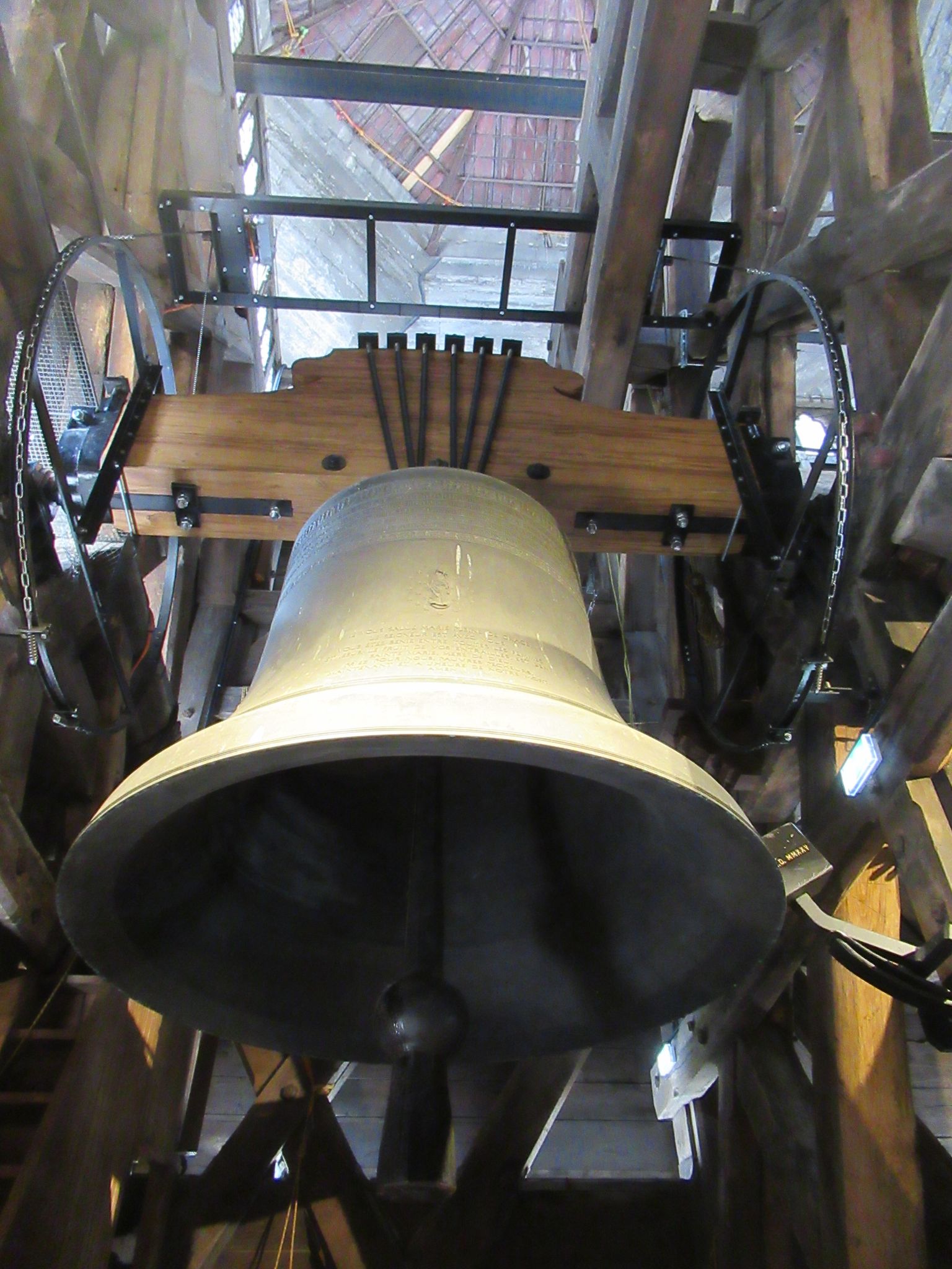 „Emmanuel“, die größte Glocke der Kathedrale, hängt an neuen Trägerbalken. Foto: Sabine Glaubitz/dpa