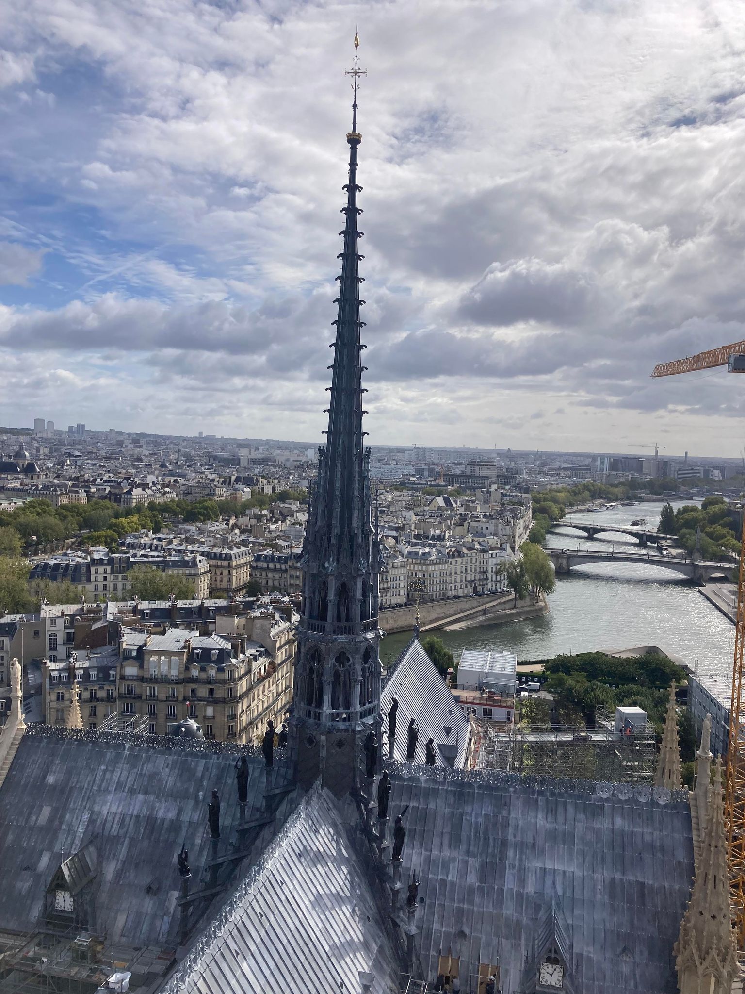 Auf dem neuen Rundgang ist auch der neue Dachstuhl zu sehen, für den mehr als 1.000 französische Eichen gefällt und ebenfalls mit Originalmethoden bearbeitet wurden. Der mittelalterliche Dachstuhl war bei dem verheerenden Brand am 15. April 2019 in Flammen aufgegangen.