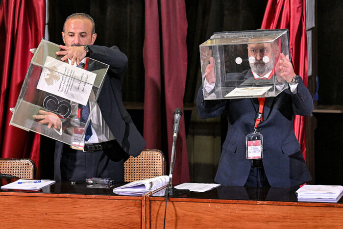 Mitglieder der lokalen Komitees Syriens überprüfen Wahlurnen am 5. Oktober 2025 in Damaskus. Foto: Louai Beshara/AFP via Getty Images