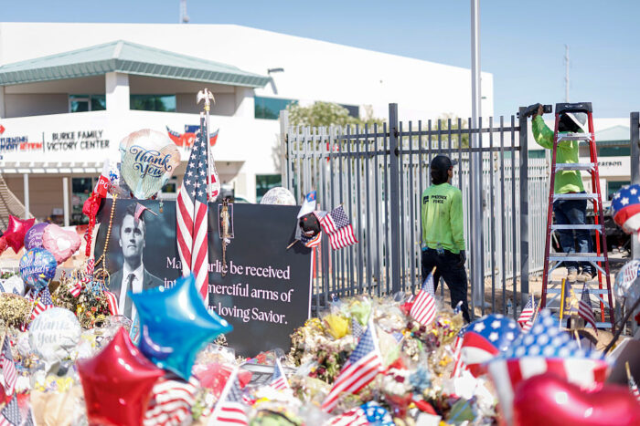 Arbeiter installieren am 15. September 2025 in Phoenix, Arizona, einen Zaun am Hauptsitz von Turning Point USA in der Nähe einer Gedenkstätte für Charlie Kirk. Die Organisation gewinnt seither viele neue Mitglieder. Foto: Eric Thayer/Getty Images
