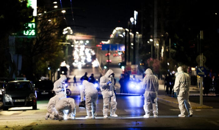 Mitglieder der Antiterroreinheit der griechischen Polizei untersuchen nach einer Bombenexplosion am 11. April 2025 in Athen, Griechenland, den Bereich vor den Büros des Eisenbahnverkehrsunternehmens Hellenic Train. Foto: Aris OIkonomou/SOOC/AFP via Getty Images