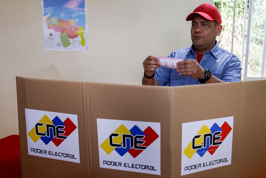 Der regierungsnahe Kandidat für das Amt des Gouverneurs von Guayana Esequiba, Neil Villamizar, am 25. Mai 2025 in einem Wahllokal während der Regionalwahlen in El Dorado, Venezuela. Venezuela beansprucht Essequibo für sich, ein 160.000 km² ölreiches Gebiet in Guyana. Foto: Pedro Mattey/AFP via Getty Images