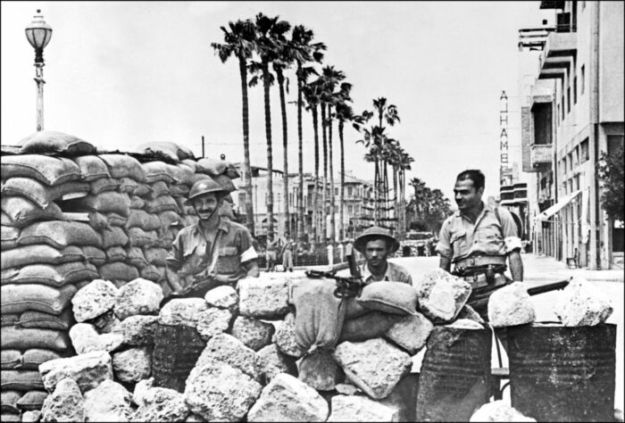 Mitglieder der Haganah, der Selbstverteidigungstruppe der Jewish Agency, am 21. Mai 1948 in den Straßen von Jaffa hinter einer Barrikade. Sie halten Wache während der Kämpfe mit arabischen Streitkräften, die am 14. Mai 1948 in Israel einmarschiert waren. Foto: AFP via Getty Images