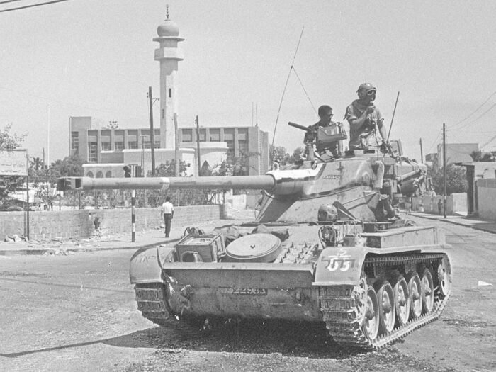 Auf diesem Foto aus dem Juni 1967 patrouilliert ein israelischer Panzer in der Nähe einer Moschee. Foto: Pierre Guillaud/AFP FILES/AFP via Getty Images