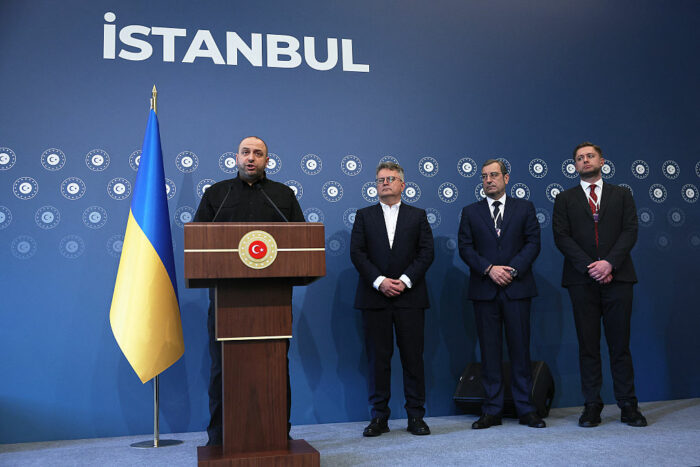 Der Leiter der ukrainischen Delegation ist Verteidigungsminister Rustem Umierov (l.). Nach dem zweiten Treffen am 2. Juni 2025 äußerte er sich vor der Presse. Foto: Adem Altan/AFP via Getty Images