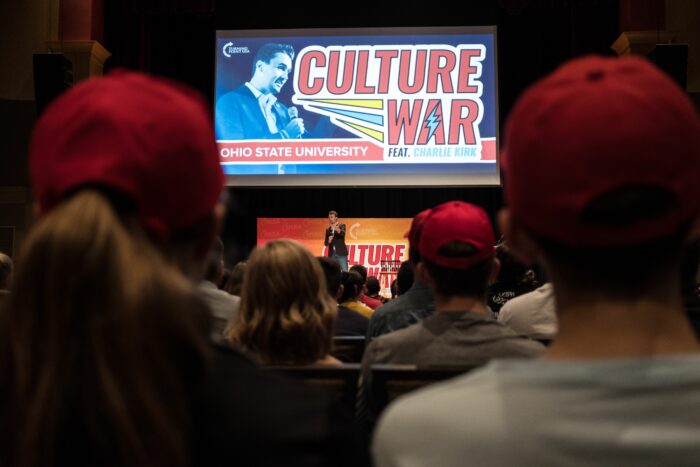 Die Teilnehmer hören Charlie Kirk zu, der am 29. Oktober 2019 bei einer Veranstaltung von Turning Point USA Culture War an der Ohio State University in Columbus, Ohio, spricht. Foto: Megan Jelinger/AFP via Getty Images