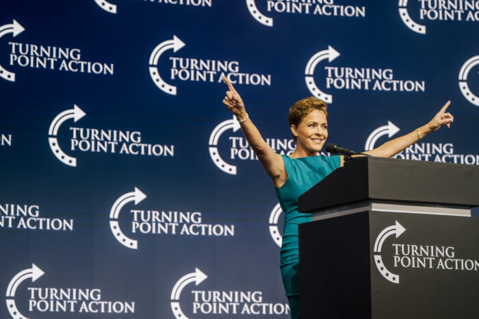 Die ehemalige „Fox-News“-Moderatorin Kari Lake spricht während der Konferenz „Rally To Protect Our Elections“ (Kundgebung zum Schutz unserer Wahlen) in Phoenix am 24. Juli 2021. Kirk gründete 2019 TP Action, eine Plattform zur Wahlkampfführung für Kandidaten. Foto: Brandon Bell/Getty Images