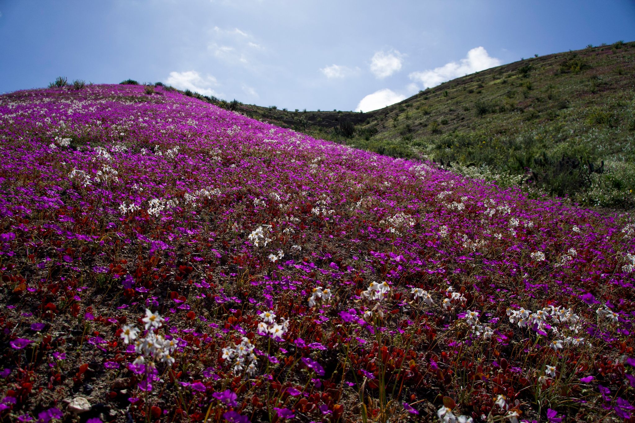 Blumen bedecken die Atacama-Wüste in der Nähe von Copiapo in Chile. Das Phänomen tritt nur auf, wenn seltene, starke Regenfälle die Blumen zum Blühen bringen. Foto: Matias Basualdo/AP/dpa