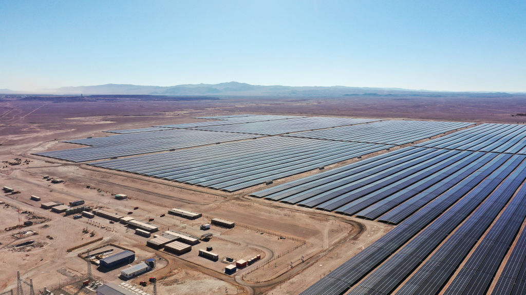 Luftaufnahme der Solaranlage CEME1 am 8. Juli 2024 in der Nähe der Stadt Maria Elena in der Region Antofagasta, Chile. Es ist die größte Solaranlage des Landes mit 882.720 PV-Paneelen auf einer Fläche von 370 Fußballfeldern. Foto: Pablo Rojas/AFP via Getty Images