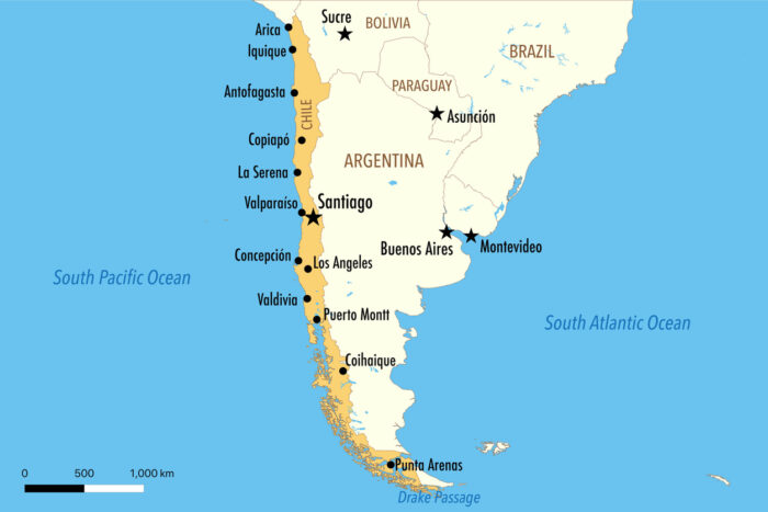 Chile liegt auf der westlichen Seite Südamerikas. Foto: Dimitrios Karamitros/Vector Map of Chile with Major Cities – Editable Illustration
