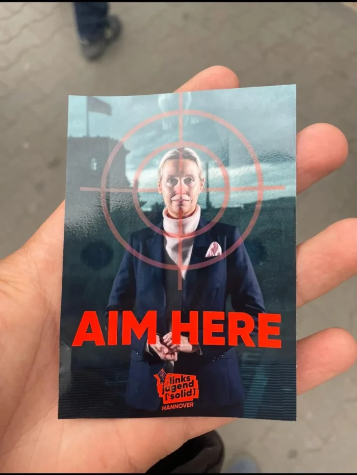 Der Sticker zeigt Weidel nicht nur im Fadenkreuz. Darunter steht in englischer Sprache „Aim here“ (Ziele hier). Am unteren Rand ist das Logo der „Linksjugend [’solid] Hannover“ zu sehen. Ob die Jugendorganisation der Linkspartei tatsächlich als Urheber infrage kommt, sei derzeit Teil der Ermittlungen der Polizei, so der Sprecher gegenüber Epoch Times.