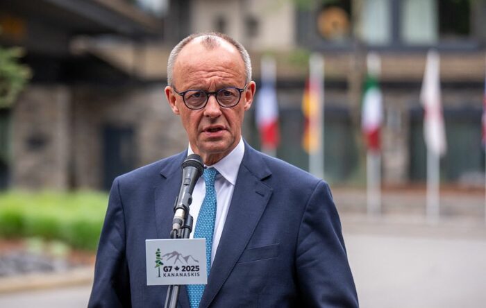 Bundeskanzler Friedrich Merz gibt am Ende des G7-Gipfels in Kanada, am 17. Juni 2025 eine Erklärung ab. Foto: Michael Kappeler/POOL/AFP via Getty Images