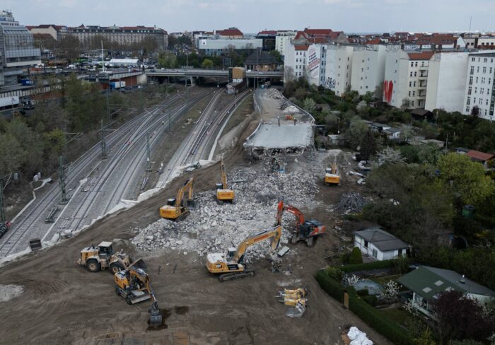 Luftaufnahme der Baustelle der Ringbahnbrücke der A100 im Berliner Westen. Der Abriss der maroden Ringbahnbrücke hat am Wochenende begonnen. Foto: Hannes P. Albert/dpa