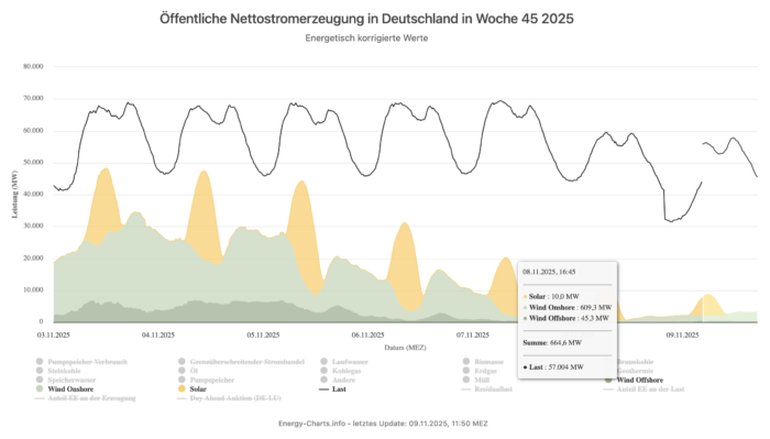Die dunkle Jahreszeit hat bereits begonnen. Wie auch im Vorjahr stellt sie erneut einen Stresstest für Deutschlands Energieversorgung dar. Am Freitagabend, 7. November, begann die erste Dunkelflaute des Winterhalbjahres 2025/26.
