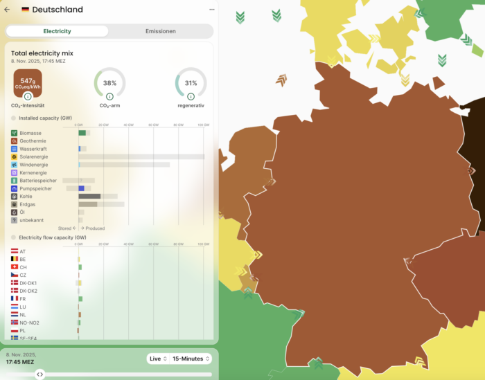 Stromerzeugung und grenzüberschreitender Stromhandel sowie die CO2-Bilanz von Deutschland am Samstagabend, 8. November 2025. Foto: Bildschirmfoto Electricity Maps