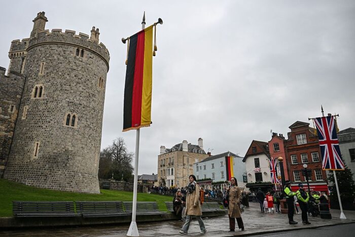 Am 27. November 2025 vor dem Windsor Castle in Windsor westlich von London: Britische und deutsche Flaggen für Bundespräsident Frank-Walter Steinmeier sind gehisst. Foto: Justin Tallis/AFP via Getty Images